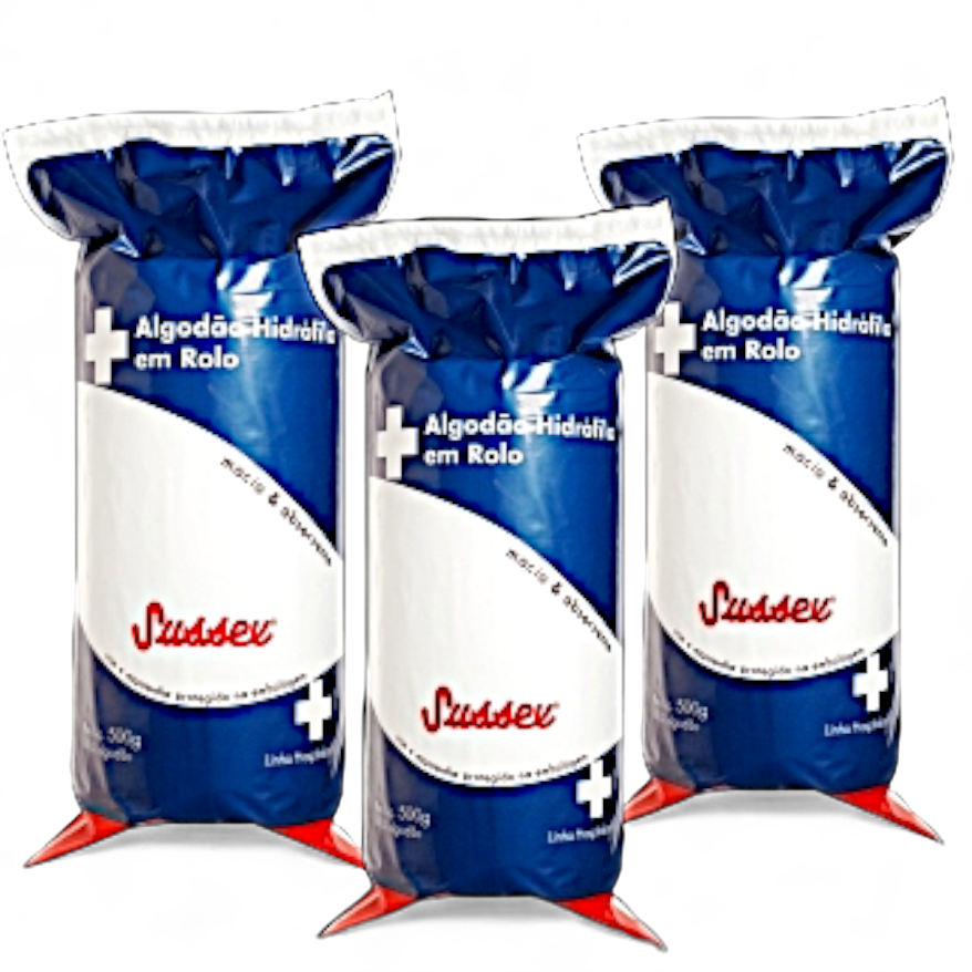 Algodão Hidrófilo Em Rolo 500 Gramas Sussex - 03 Unidades Algodão Hidrófilo em rolo Peso: 500g Código: 7500 Fardo com 3 unidades Apresentação: Sacos plásticos Recomendações de uso: Assepsia / Remoção de esmalte