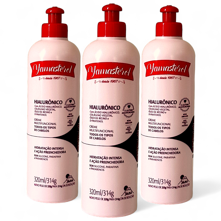 Creme Acido Hialuronico Yasmasterol 320g 2 Unidades O novo Multifuncional da Yamá possui em sua fórmula, além do Ácido Hialurônico, também Colágeno Vegetal, Óleo de Rícino e D Pantenol. E cada um desses componentes traz um benefício específico para os cabelos, confira: Ácido Hialurônico ? Potencializa a hidratação, preenche a fibra capilar e encorpa os fios;