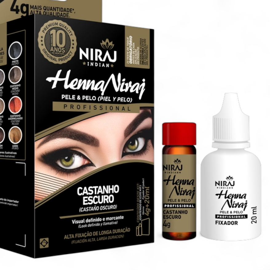 A Henna Niraj Designer para Sobrancelhas na cor Castanho Escuro é ideal para quem busca definição, preenchimento e um olhar marcante. Este kit completo é formulado para atuar eficazmente tanto na pele quanto nos pelos, proporcionando um acabamento profissional no conforto da sua casa. Com 4g de henna e 20ml de fixador, você possui tudo o que precisa para camuflar imperfeições e auxiliar no crescimento dos pelos, realçando naturalmente seu olhar.